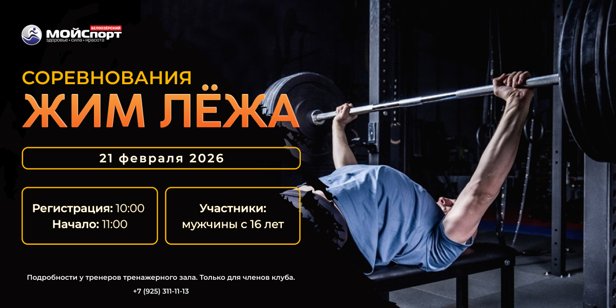 Приглашаем желающих принять участие в соревнованиях по жиму лежа штанги, которые состоятся 21 февраля в субботу в тренажёрном зале нашего фитнес-клуба «МОЙСпорт» Белоозерский.